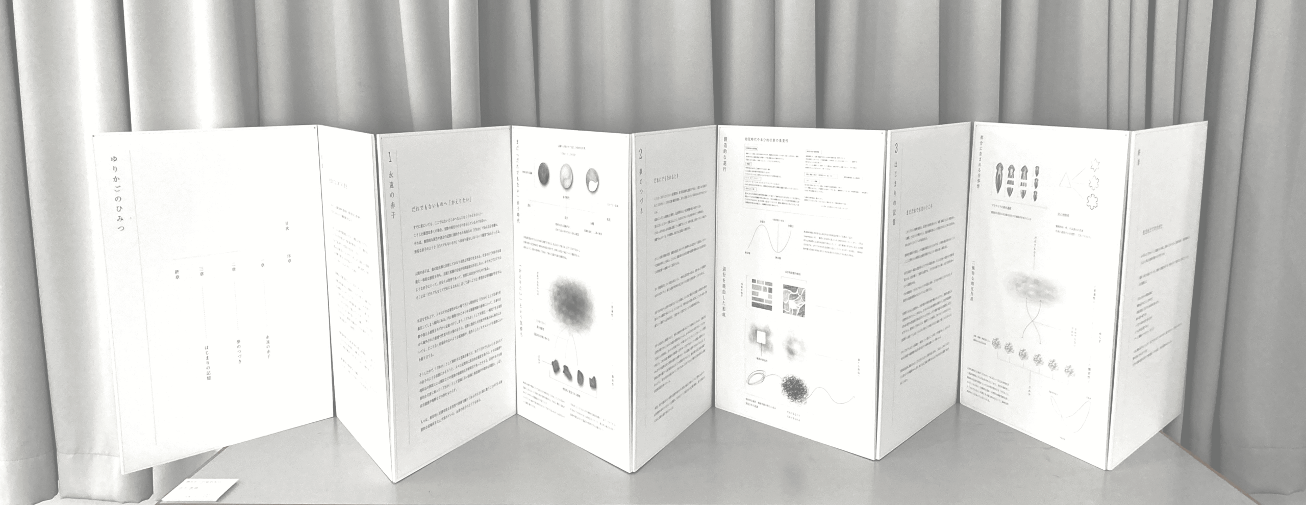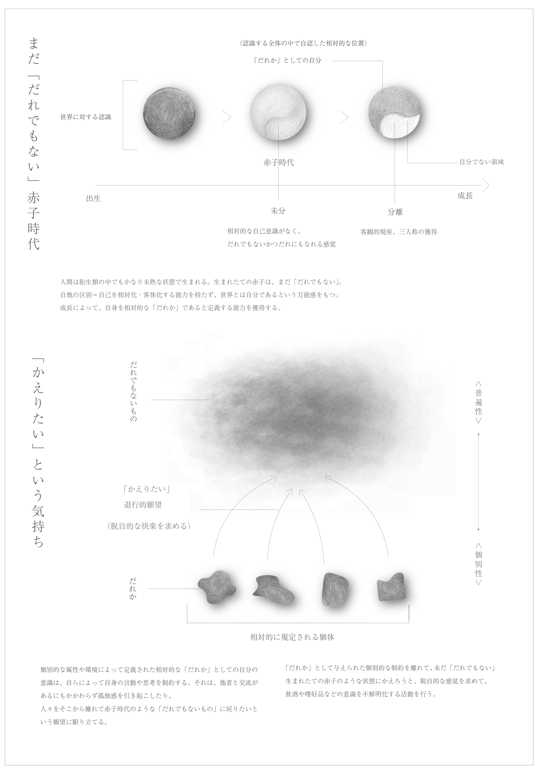 本制作では、乳幼児期の世界と地続きのような、内と外のあいまいなところ、退行を経た発展のプロセスについて包括的に探究した。